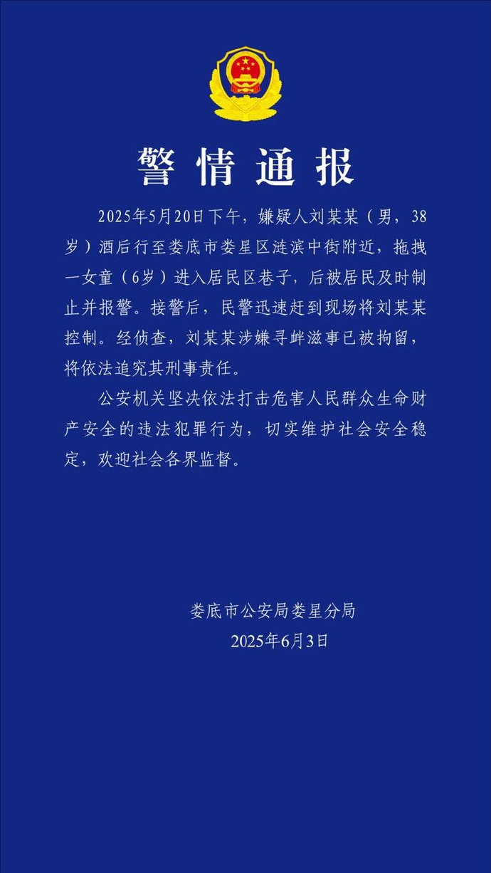 #男子拖拽女童进小巷被拘#6月3日,湖南娄底市公安局娄星分局通报,5月20日下午,嫌疑人刘某某(男,38岁)酒后行至娄底市娄星区涟滨中街附近,拖拽一女童(6岁)进入居民区巷子,后被居民及时制止并报警。接警后,民警迅速赶到现场将刘某某控制。经侦查,刘某某涉嫌寻衅滋事已被拘留,将依法追究其刑事责任。