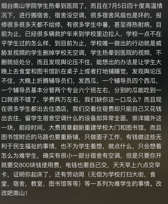 7月5日 烟台南山学院让学生40度的天搬宿舍,还没空调,多名学生热进医院被抬走。随后学校对高温中暑提出了以下解决方案:1.威胁学生删同学热晕被救护车抬走的视频;2.为天气炎热入睡困难的学生提供一对一心理疏导,引导学生乐观向上的生活态度。7月6日晚,学校先以“9号放假”为由让学生们删除视频。待学生们把社交媒体上的帖子删除,买票准备回家之时,学校再突然通知9号正常考试。7月6日,有烟台南山学院的学生家长给烟台12345打电话反馈称,自己给烟台南山学院打电话,问招生情况就很热情,但一说到寝室没电没空调,学校就把电话给挂了。7月6日晚,烟台文化旅游学院,一晚上3个学生因中暑被救护车拉走急救。整个宿舍区集体喊楼要求装空调。7月6日晚,烟台理工学院,三辆救护车进学校拉中暑学生。7月6日晚,烟台职业学院的学生因为中暑被救护车拉走。