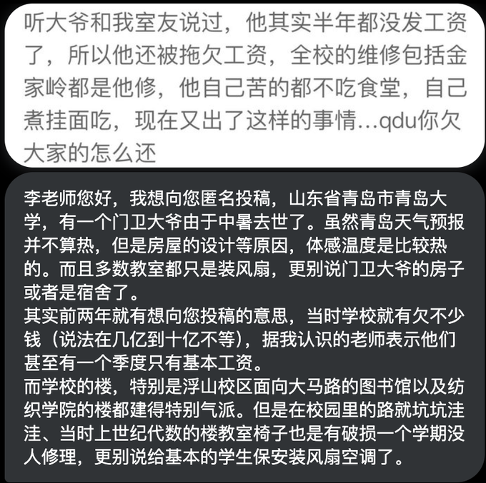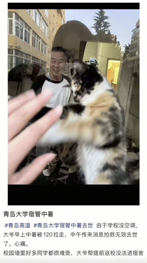 7月6日,青岛大学的一位宿管老爷爷因高温中暑离世,临终前还在照顾刚生育的流浪猫。引发悲愤的学生们集体悼念。学生称,宿舍至今未安装空调,基层人员也待遇极差,老爷爷去世前工资被拖欠8个月,而领导却坐在空调办公室里不闻不问。学生表示,没有人民拥戴的政府迟早倒台,没有学生爱戴的学校迟早倒闭!7月7日凌晨,青岛大学再有一名宿舍管理员因中暑被救护车拉走抢救。青岛大学学生喊话学校负起责任,不要再删学生帖子了,给底层人民一个好的工作环境,不要只知道捣鼓自己的“网红毕业典礼”。7月6日,青岛大学的学生们前往宿管爷爷生前居住的小屋前献花。