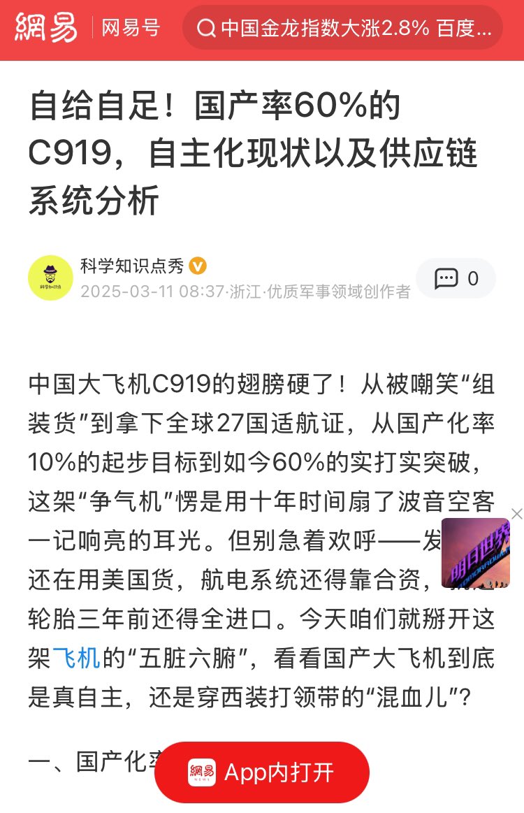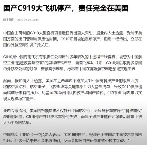 中国自主研制的C919大型客机项目近日传出重大变动。据业内人士透露,受制于美国方面的出口管制与供应链封锁,C919项目被迫宣布停产。消息一经传出,立即在国内外航空界引发广泛关注。那之前为啥把国产大飞机C919的“成功”归功于习主席?前后看看合订本,中共的逻辑就是个神经病。