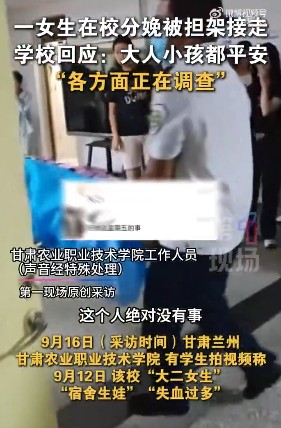 9月16日,甘肃兰州。有学生拍视频称,甘肃农业职业技术学院一大二女生9月12日“宿舍生娃”“失血过多”。视频中,有人被担架抬出,疑似一名婴儿也被抱走。该校值班人员回应第一现场记者称,女生和婴儿平安,事件正在调查中。