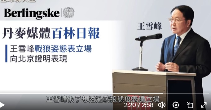 近日,据丹麦《百林日报》报道,今年2月底,台湾驻丹麦代表郑荣俊出席日本驻丹麦大使举办的日本天皇诞辰庆祝活动时,遭到中国驻丹麦大使王雪峰的无礼对待。王雪峰要求日本大使驱逐郑荣俊,日本大使表示无法照办。王雪峰随即愤怒离场,临走前还手指郑荣俊以示不满。——想利用外交战狼模式来诓习总的好感吧?