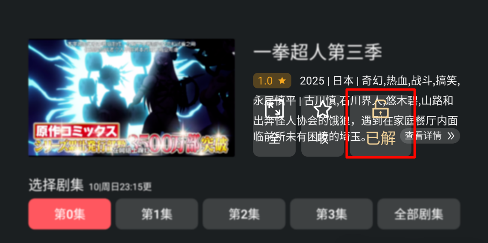 这里我随便打开一个动漫,可以看到是已解锁的