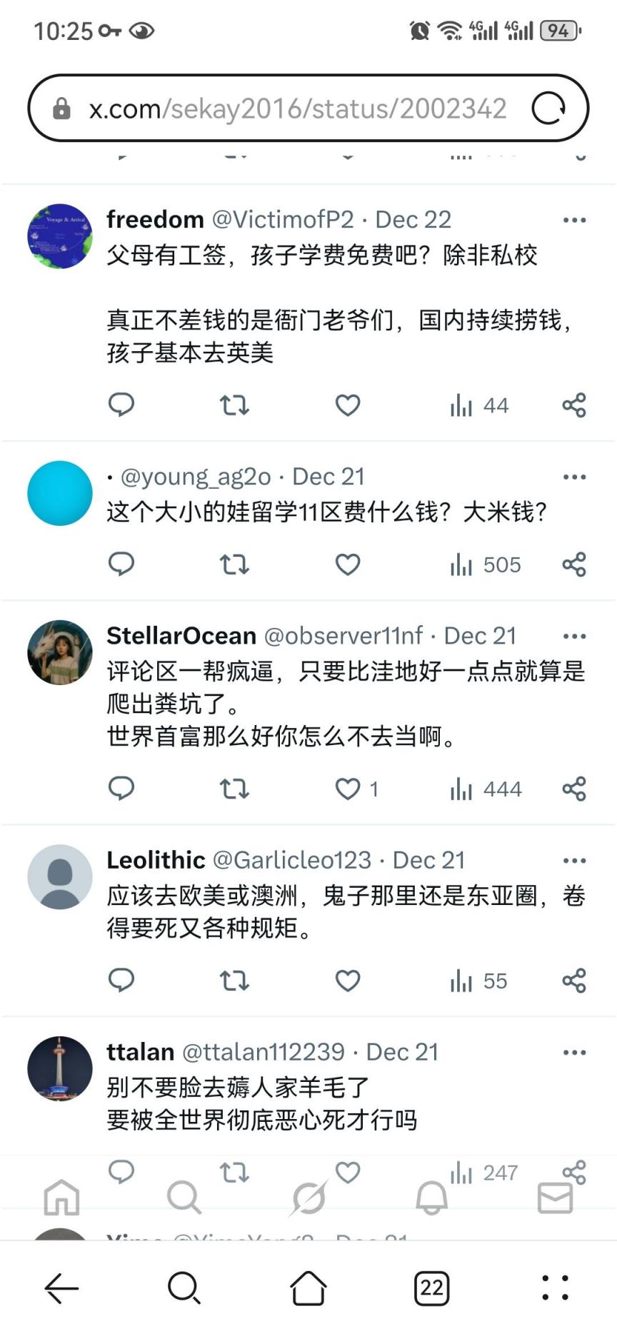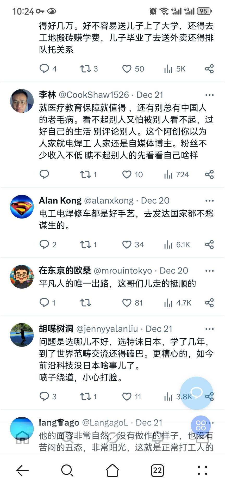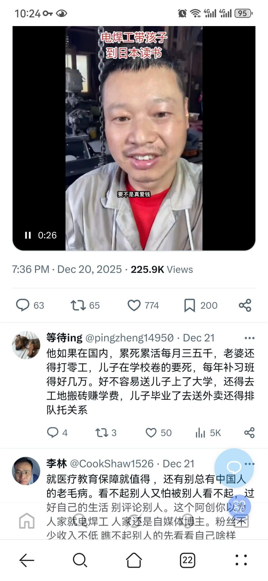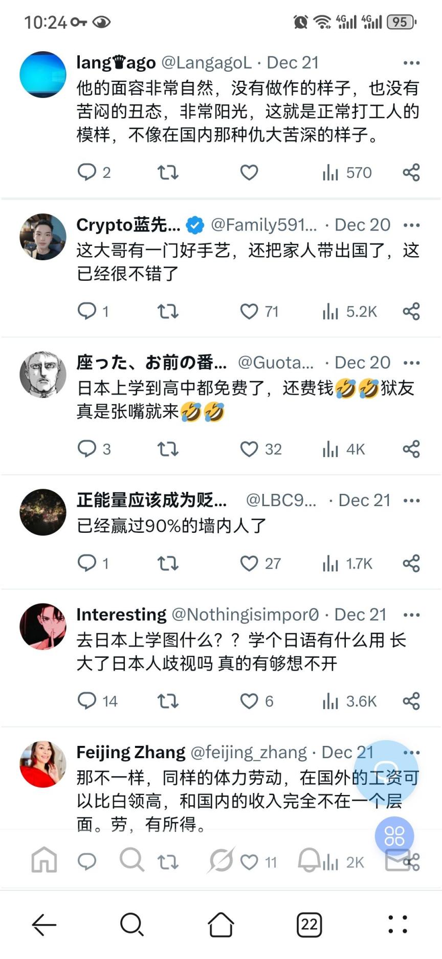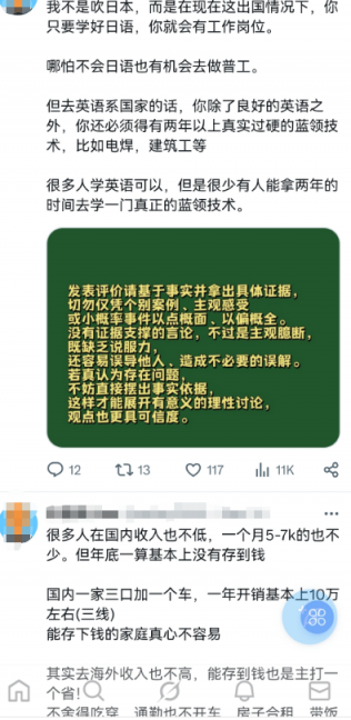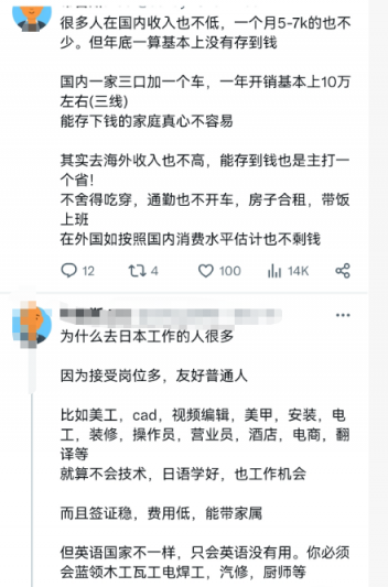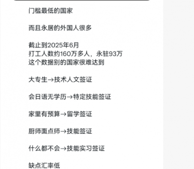 图片来自X, 就不多做评论了,有一点说的很对,有些国家的工资收入也不一定比国内强,但是一年下来能攒下点钱,还有一点能受到尊重,有能力的可以润欧美澳新等,对于很多普通人,想要带全家出去,又有机会拿个身份,目前能想到的可能就属日本有希望。