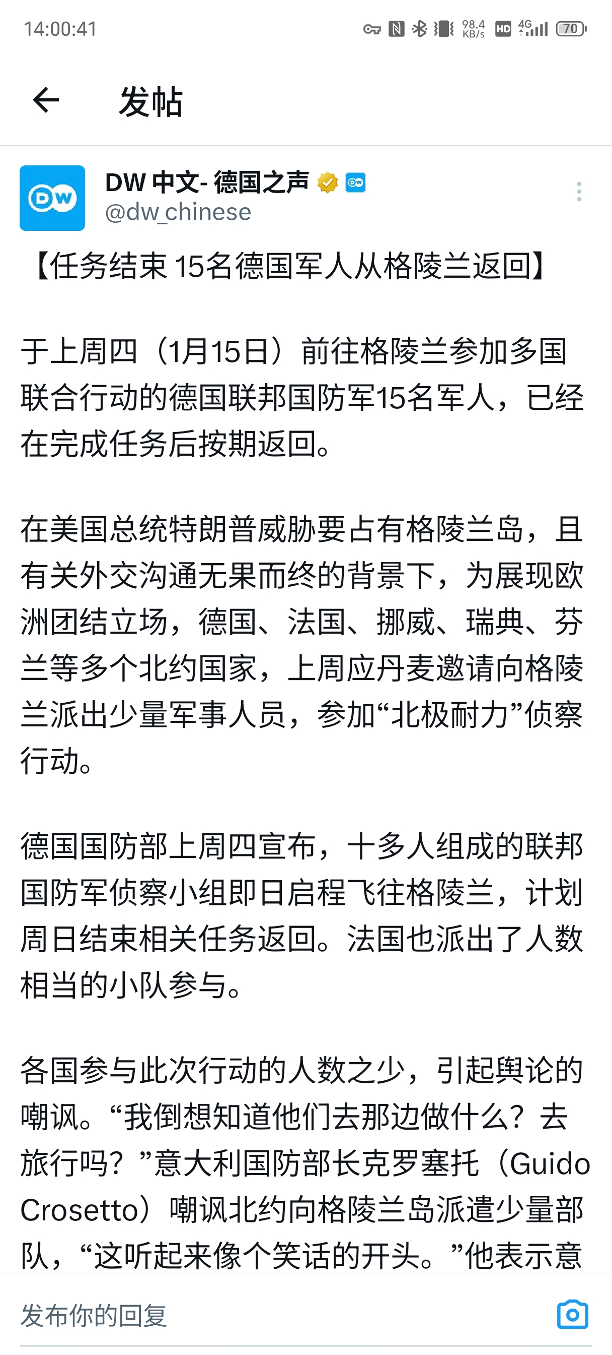 德媒《明镜》周刊报道称,德军在行动中的主要任务为后勤支援,并援引一名参与任务的丹麦士兵坦言:“我不认为欧洲的军事行动能阻止特朗普的计划。”